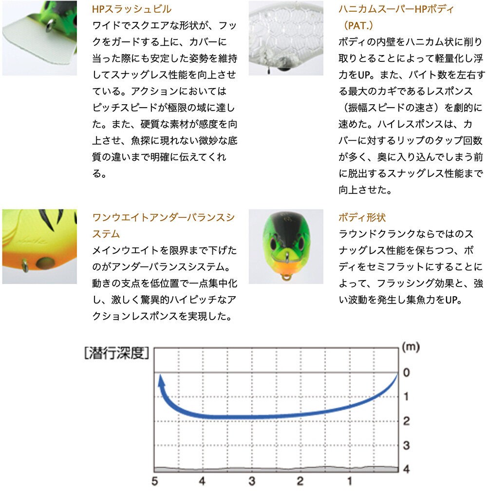 高浮力ボディーのクランクにより、強力な水押しでバスの測線にアピールさせます。特に激濁りに強く、ストラクチャーへコンタクトした時に巻きを止めて障害物を交わしながらサーチ出来る点が強み。一方ストラクチャーに引っ掛けて千鳥アクションになった瞬間に食わすといったテクニックも有効です。