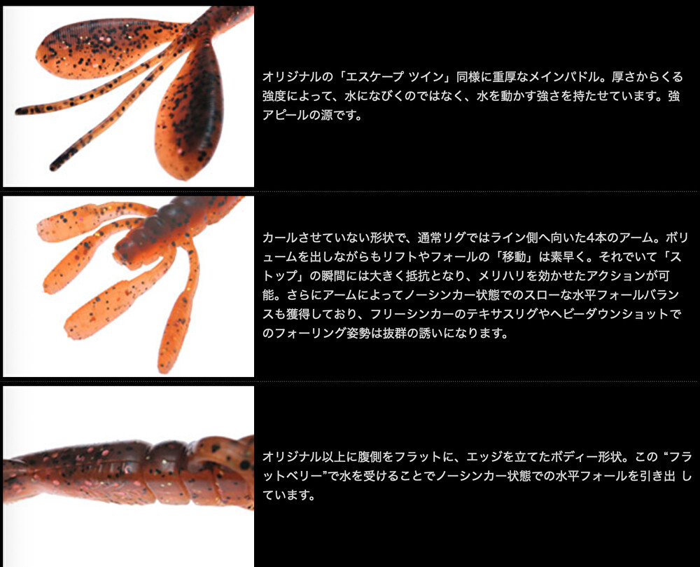 「ノリーズ  エスケープチビツイン」はスローもしくは放置でも自発的に手足を動かしオートマチックにバスを誘います。ボトム付近で自発的に動いてくれるので、まさにヘビキャロにもってこいのワームです。