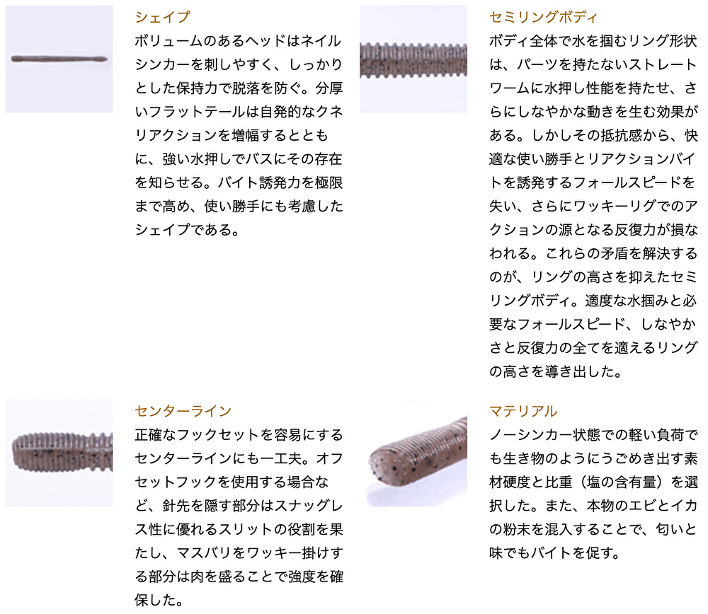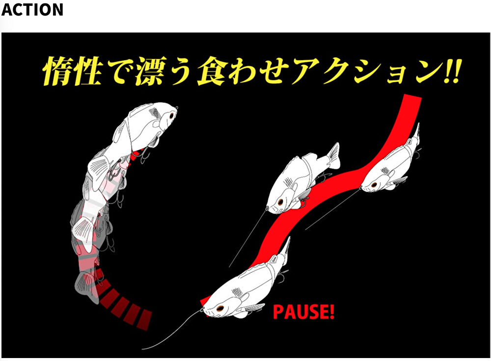 ストップ&ゴーやジャーキングの後にポーズをすると自らの意思で動いているかのように惰性で漂います。その際の180°ターンするアクションが食わせのスイッチをバスに入れます。