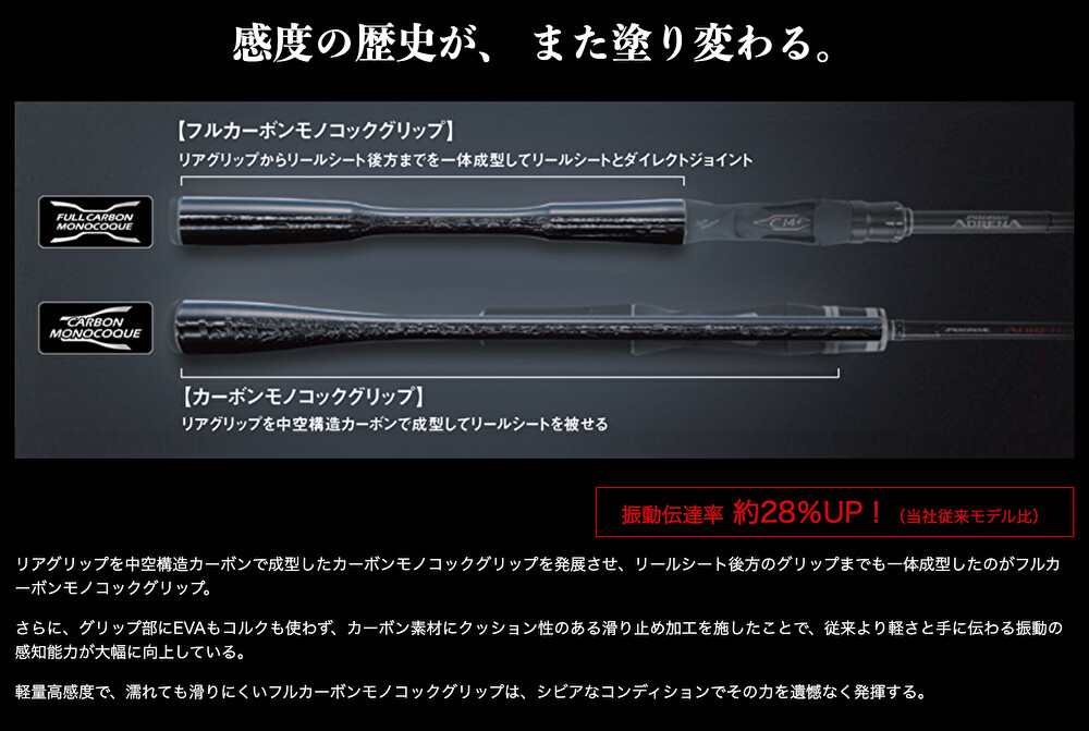 攻めのフルスペックの中でも注目すべきは感度。フルカーボンモノコックグリップを採用しているため、ティップから入力された振動がダイレクトに手に伝わる感覚があります。