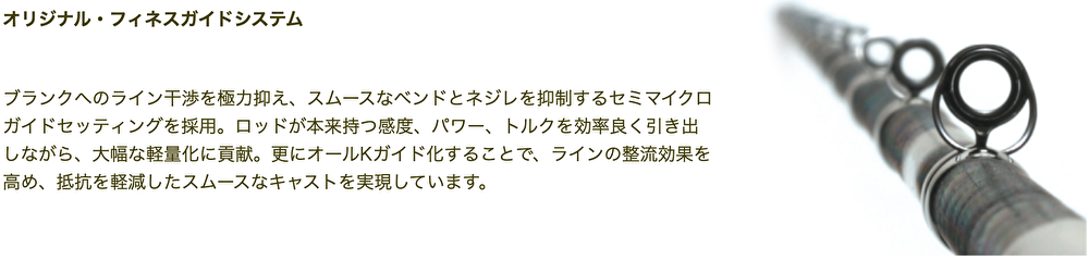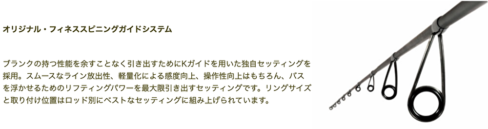 曲げ込むほどにベンディングポイントがティップ〜バットへ移行する、とてもスムースなテーパーを持ったライトパワーバーサタイルのスピニングです。またドライスティックなハイテーパー化を導入したブランクは軽量・高感度の仕様となっています。