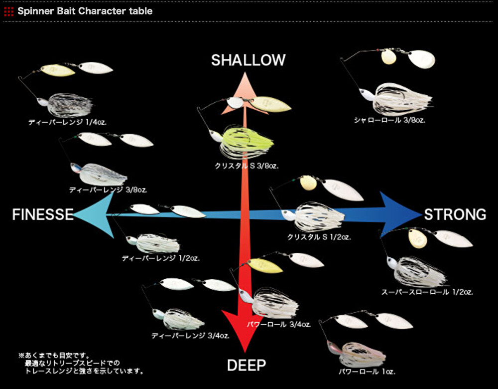 特徴は、種類が豊富で様々なパターンにあったスピナーベイトを選択することが出来る点です。単純に”重さ”が違うだけではなく、コンセプトに合わせた専用設計が施されているため、シチュエーションごとの最適なパフォーマンスを演出してくれます。