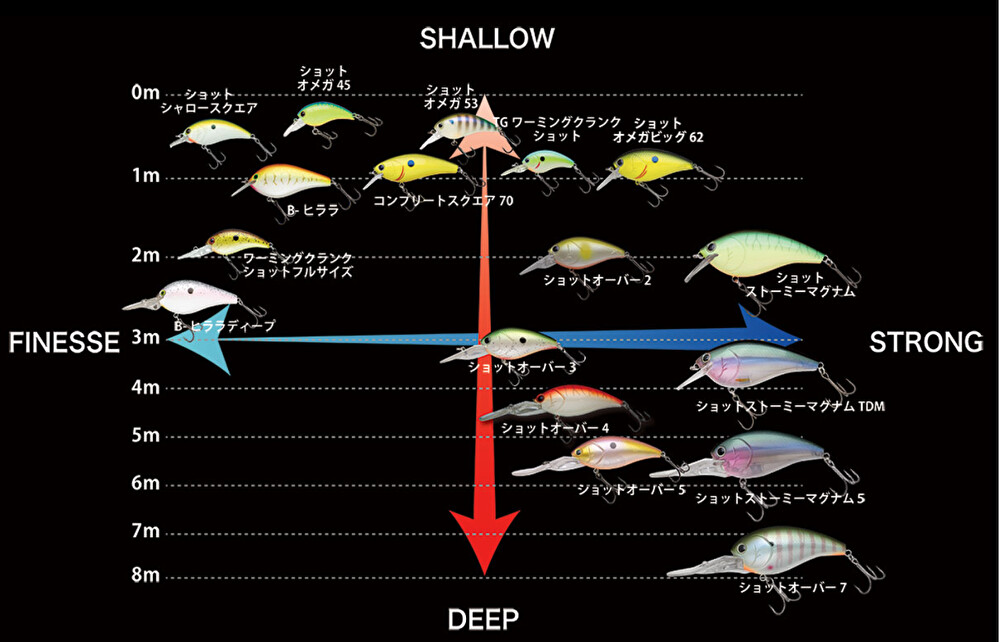 このショットオーバーは対応レンジごとに2~7の種類があります。水深3m程度を意識する場合は2か3を、また強さについてはフィネスとストロングの中間がオススメです。