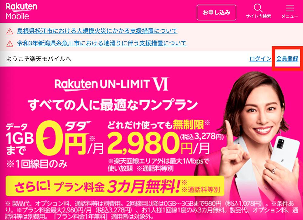 こちらの楽天モバイルを開きます。