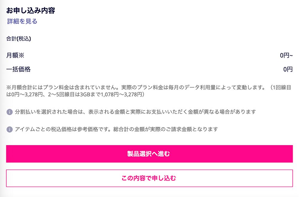【STEP5.1】”製品選択へ進む”を押した方は、欲しい端末を選び、支払回数を選択して”カートに追加する”をタップします。