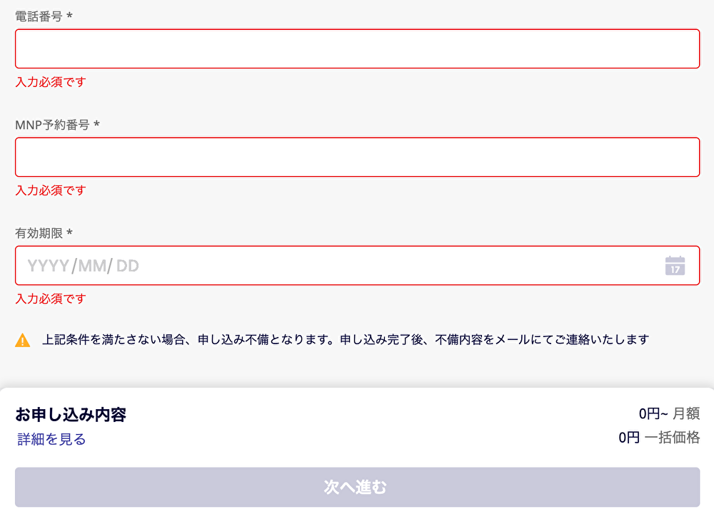 【STEP8】現在ご使用の電話番号を記入し、予め取得したMNP予約番号とMNP予約番号の有効期限を投入します。最後に一番下にある”次へ進む”をタップします。