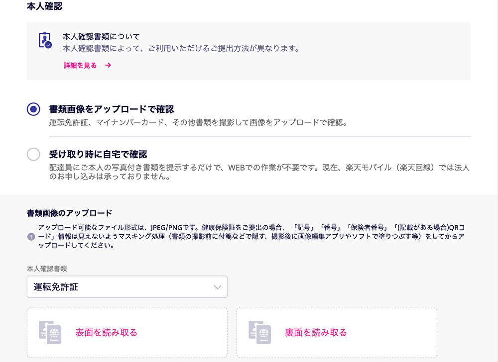 【STEP7】本人確認書類のアップロードを行います。スマホであれば、そのままカメラを使ってアップロードも出来ます。”受取時に自宅で確認”も出来ますが少し手間がかかるイメージです。